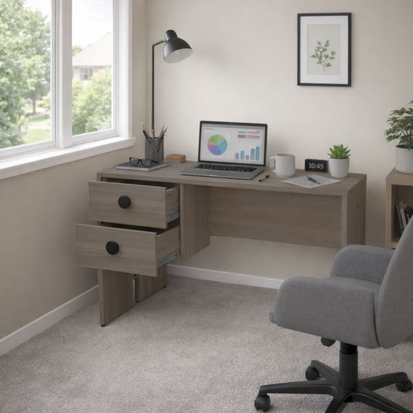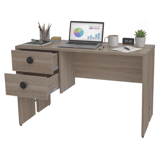 Amplio escritorio de 2 cajones con sistema de frenado asistido. Hecho en melamina de alta calidad. Ideal para estudio u oficinas.