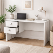 Amplio escritorio de 2 cajones con sistema de frenado asistido. Hecho en melamina de alta calidad. Ideal para estudio u oficinas.