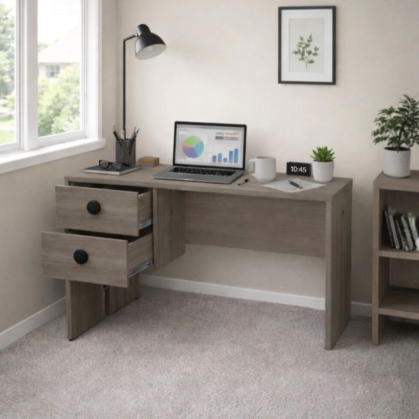 Amplio escritorio de 2 cajones con sistema de frenado asistido. Hecho en melamina de alta calidad. Ideal para estudio u oficinas.
