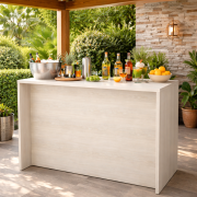 Barra para quincho de 150 cm, con espacio cómodo para sentarse, almacenamiento abierto y material resistente.