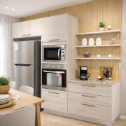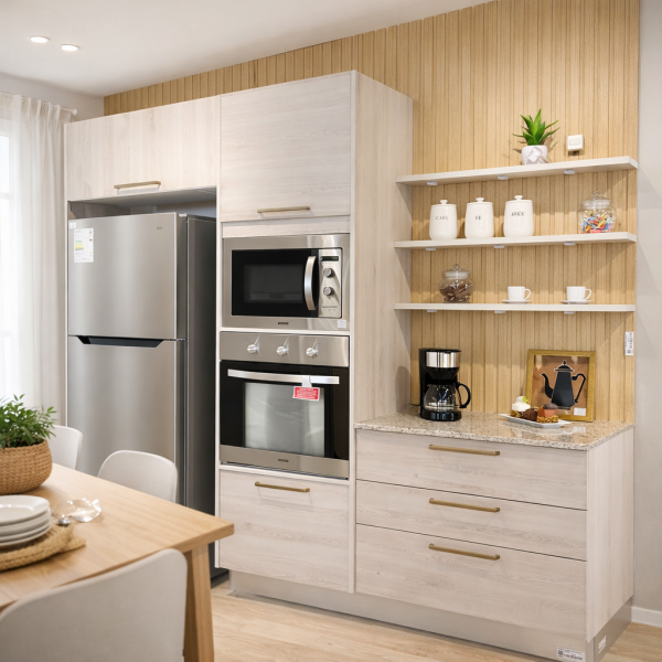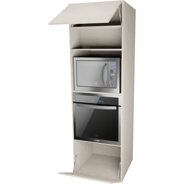 Mueble de cocina moderno para integrar horno y microondas con seguridad y ventilación adecuada. Fabricado en melamina resistente, ideal para optimizar espacio y mantener una estética limpia en la cocina.