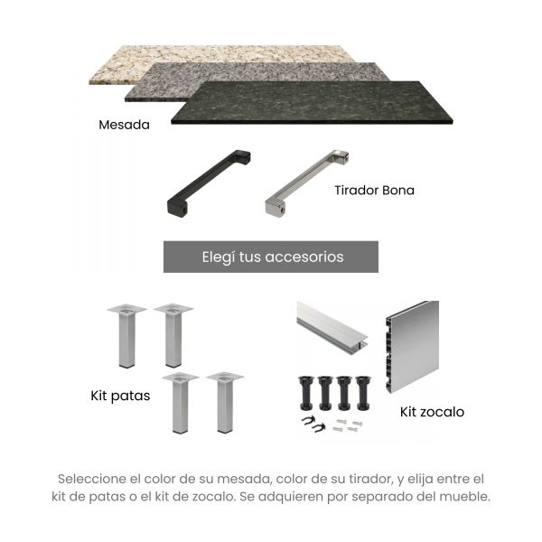 - Complementos: Mesada, patas y tiradores se adquieren por separado (las perforaciones de los tiradores ya van hechas en el mueble).