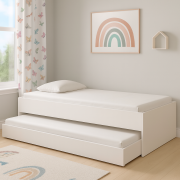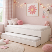 Aprovechá mejor el espacio con esta camita pequeña para niños que incluye una cama desplegable en la parte inferior, ideal para visitas o hermanos. Funcional y práctica, combina seguridad, comodidad y diseño pensado para dormitorios infantiles. Su estructura resistente garantiza durabilidad, mientras que su tamaño compacto se adapta perfectamente a habitaciones pequeñas.