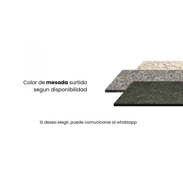 Sistema: Mesada de granito (color surtido de mesada. Si desea elegir, puede comunicarse al centro de atencion de la web), base interior del mueble, forrado en aluminio para protegerlo de la humedad, 1 puerta con sistema de frenado asistido para cierre suave.