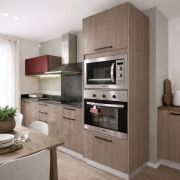 Mueble de cocina moderno para integrar horno y microondas con seguridad y ventilación adecuada. Fabricado en melamina resistente, ideal para optimizar espacio y mantener una estética limpia en la cocina.